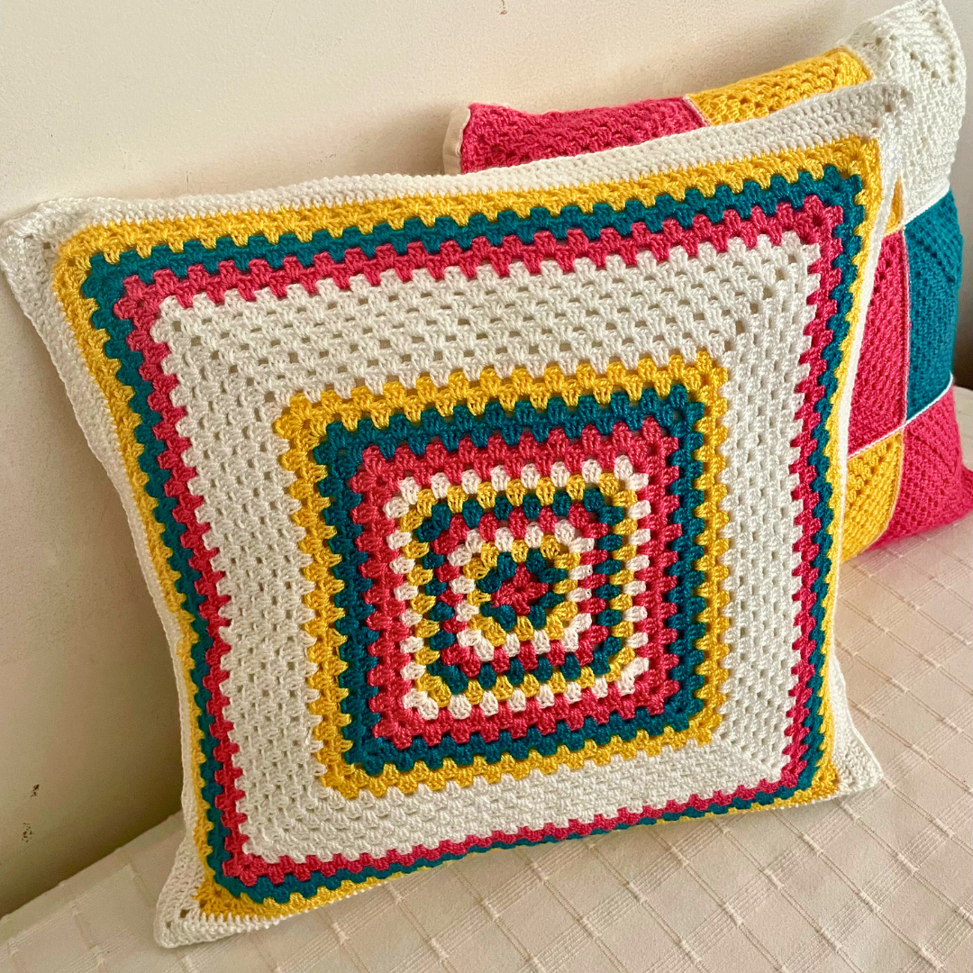 Brighten up your home with the lively hues and intricate craftsmanship of our handmade crochet cushion cover set! Featuring a playful patchwork design on one cover and a timeless granny square pattern on the other.