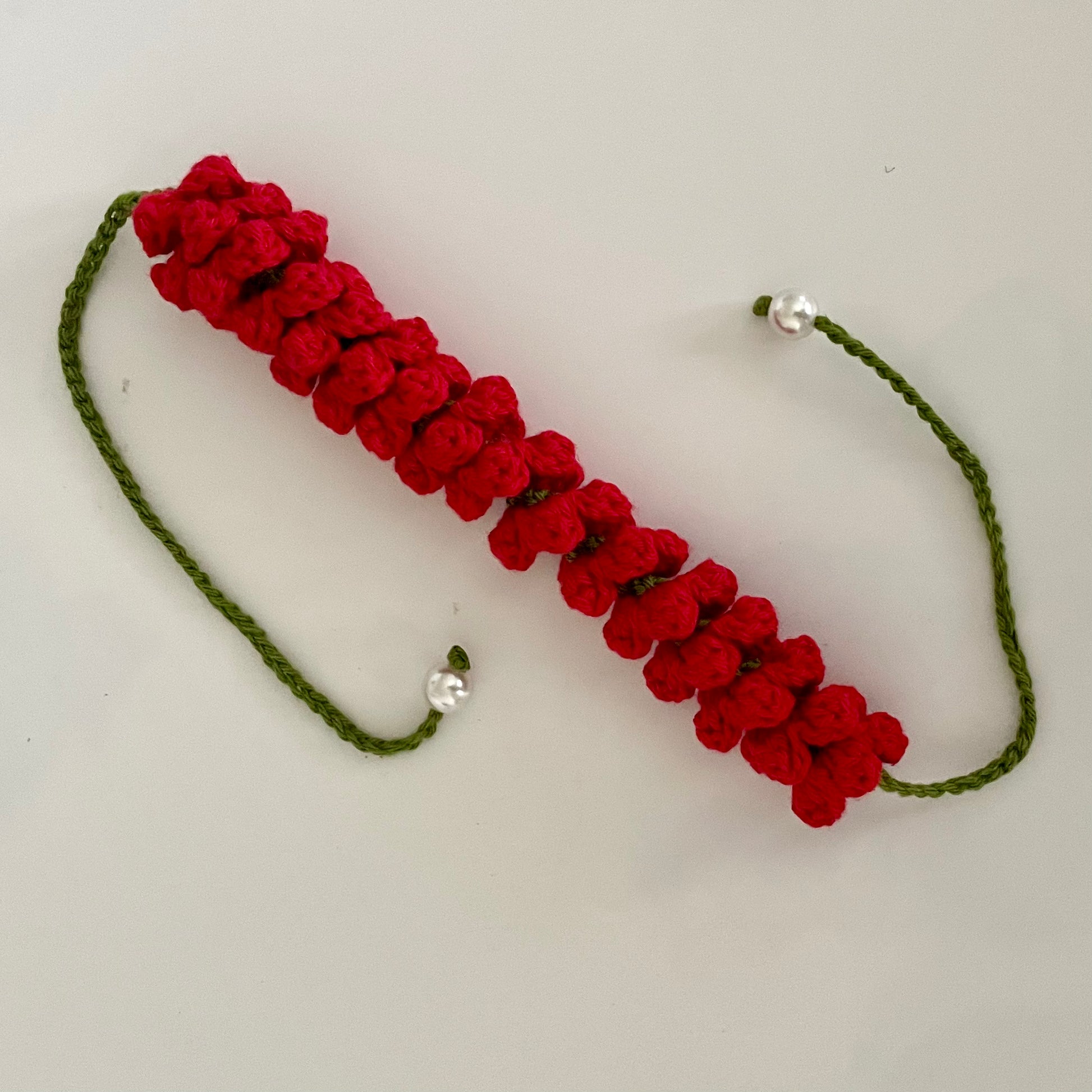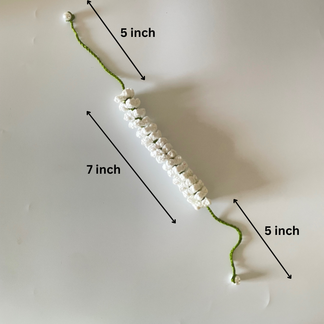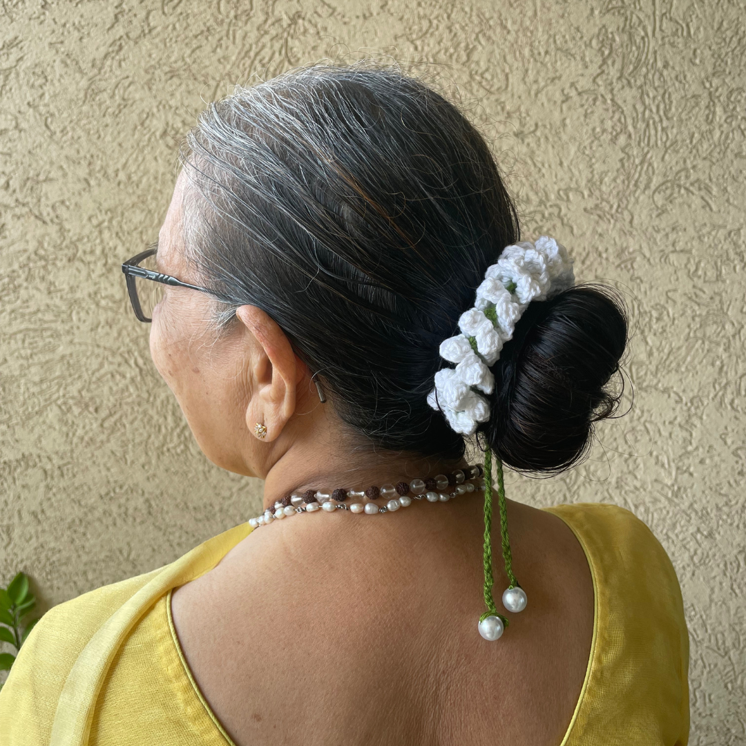 Celebrate timeless Indian beauty with a fresh, handmade twist. This crochet mogra gajra captures the soft, fragrant charm of real jasmine garlands – in thread form! Thoughtfully crocheted in pure white, with soft green stems and dainty pearl drops at each end, this elegant hair accessory for buns adds a nostalgic touch to sarees, silk suits, and festive updos. Whether it's a puja, wedding, or special occasion, this gajra gives your look the grace of tradition and the charm of craftsmanship.